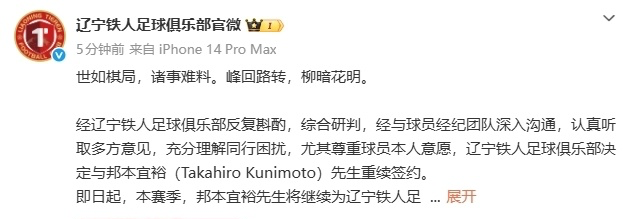 辽宁铁人在官方公告中,对于重新签下邦本宜裕解释道:经俱乐部反复斟酌,综合研判,经与球员经纪团队深入沟通,认真听取多方意见,充分理解同行困扰,尤其尊重球员本人意愿,辽宁铁人决定与日本外援邦本宜裕重续签约。